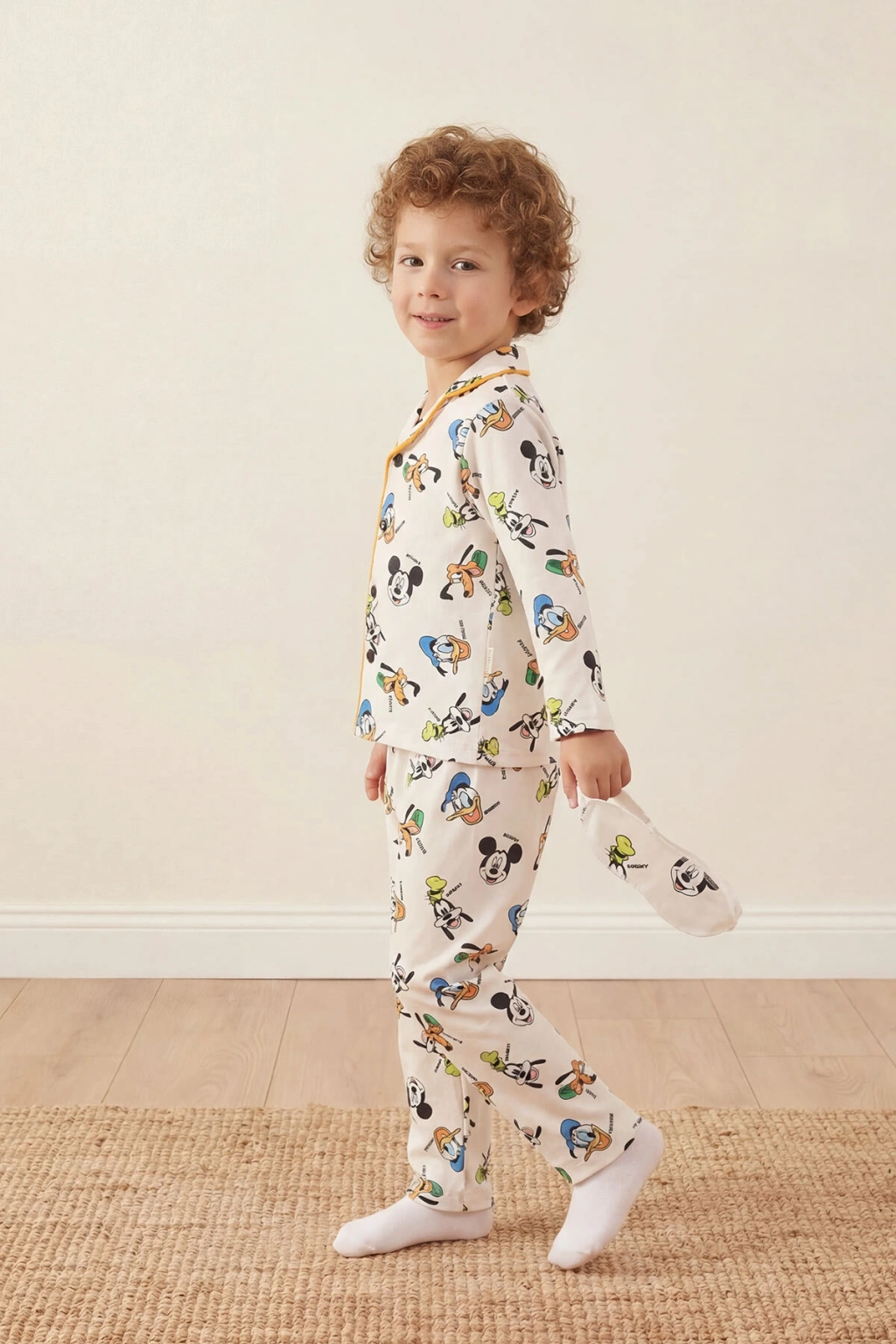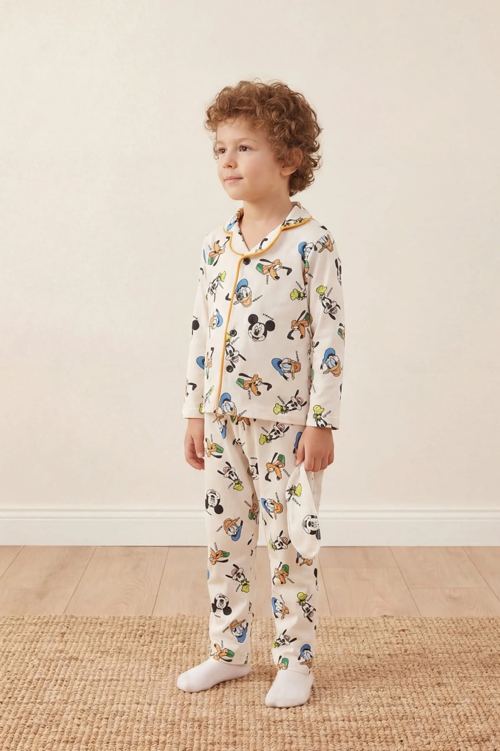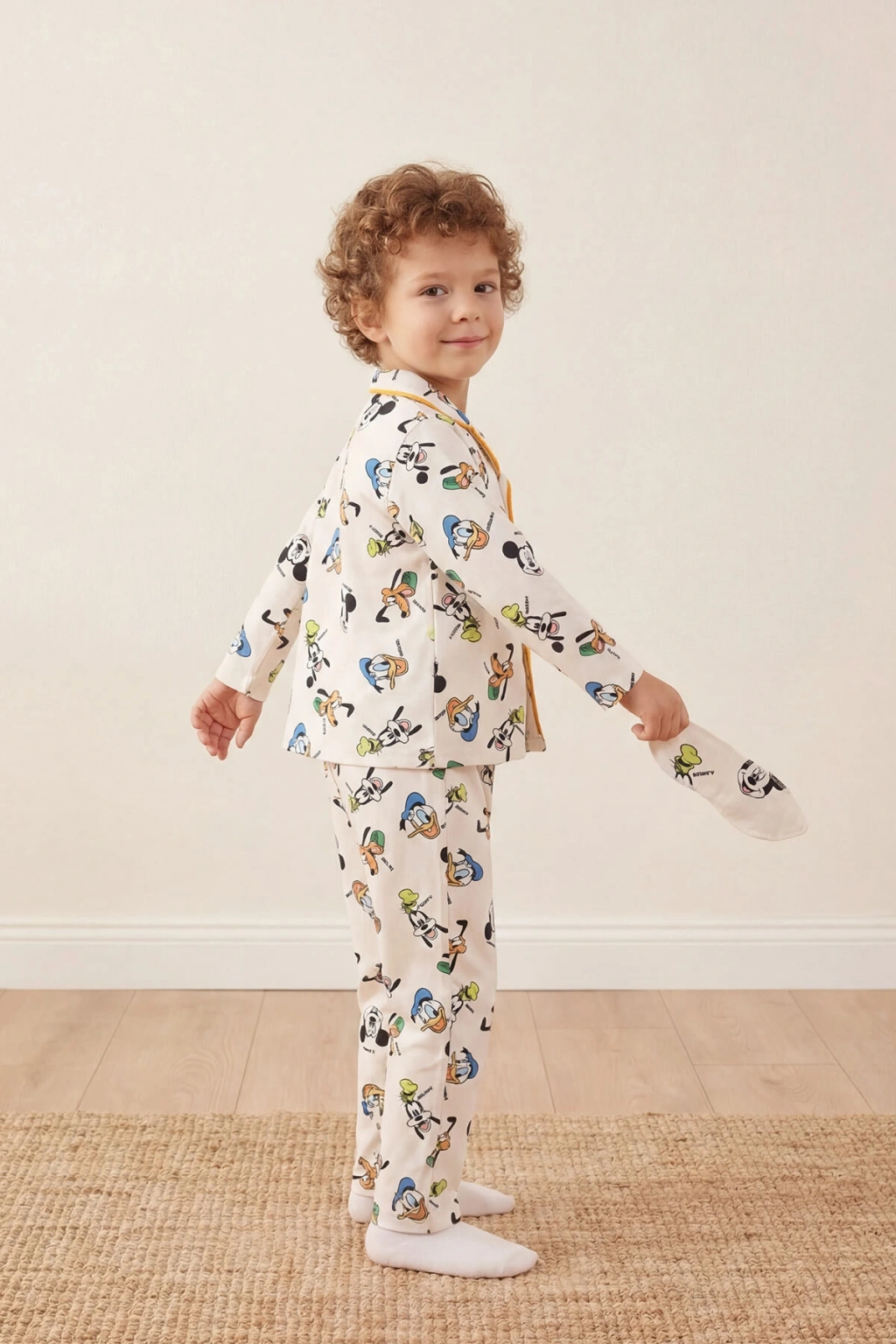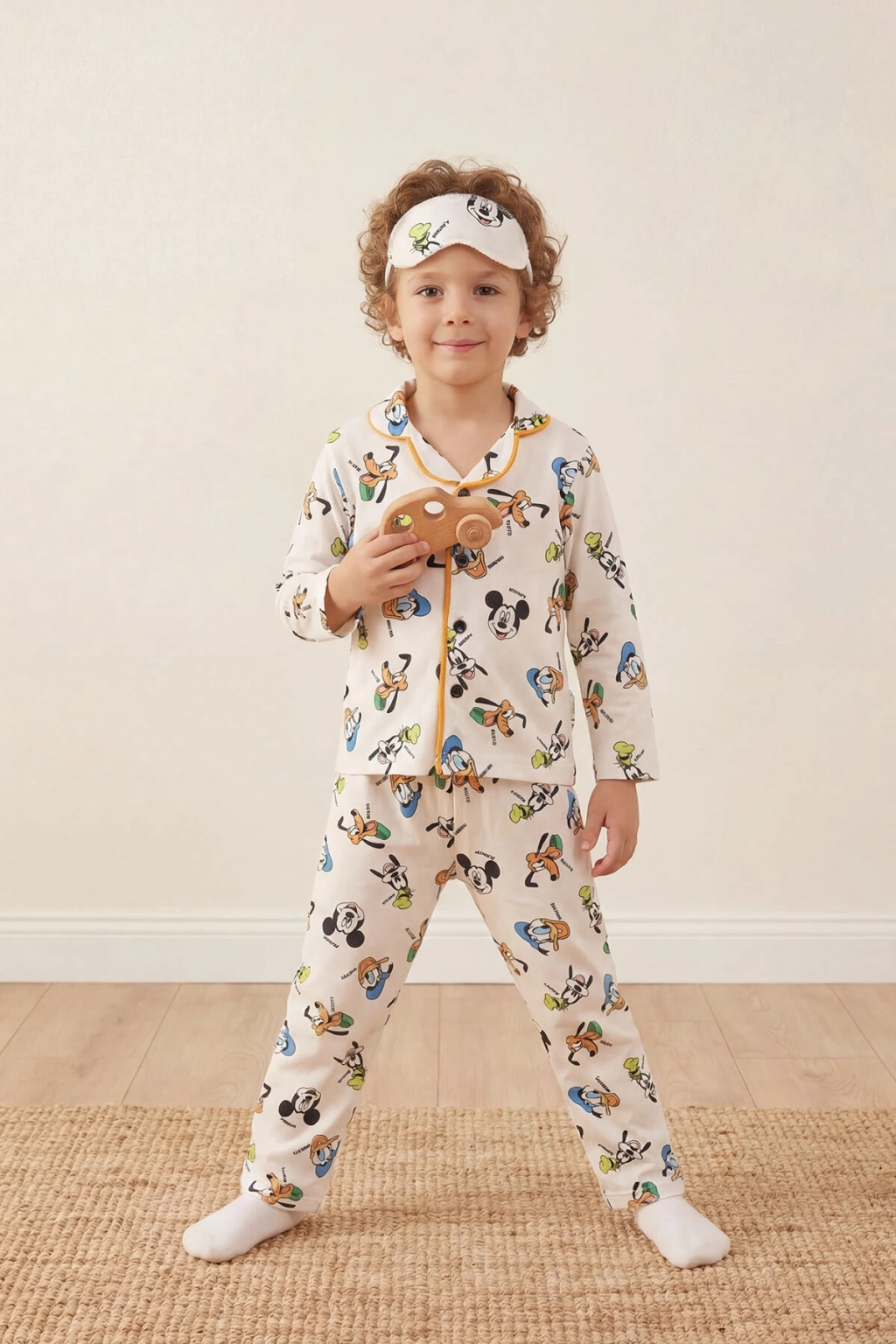 /- 3-10 yaş arası çocukların rahatlığı düşünülerek tasarlanmış, beli lastikli ve boru paça kesimiyle hareket özgürlüğü sunar.; - Göz bantlı tasarımıyla uyku saatlerini daha keyifli hale getirir ve çocukların konforunu artırır.; - Baskılı deseniyle şık ve eğlenceli bir görünüm sağlar, çocukların tarzını yansıtır.; - 24/1 penye süprem dokuma tipi sayesinde yumuşak dokusuyla cildi tahriş etmez ve uzun süreli kullanım için idealdir.; - Full düğme kapama özelliği kolay giyip çıkarma imkanı sunar, çocukların bağımsızlığını destekler.; - Uzun kollu ve uzun boy tasarımıyla mevsim geçişlerinde ideal sıcaklık sağlar, tüm sezonlarda rahatlıkla kullanılabilir.; - Biye detayları ile ürünün estetik görünümünü pekiştirirken, kaliteli işçiliğini gözler önüne serer.; - Fitted kalıbı sayesinde vücuda tam oturur ve şık bir siluet oluşturur.;