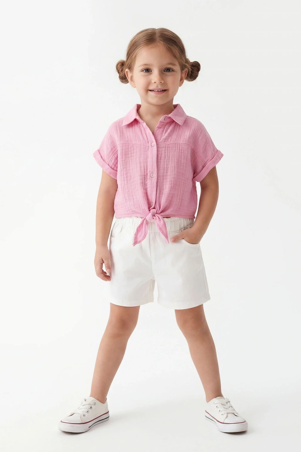 Kız çocukları için tasarlanan bu yazlık takım, sade ve şık görünümüyle günlük kombinlerin vazgeçilmezi olmaya aday. %100 pamuk kumaşı sayesinde hassas ciltler için uygundur ve gün boyu konfor sağlar.