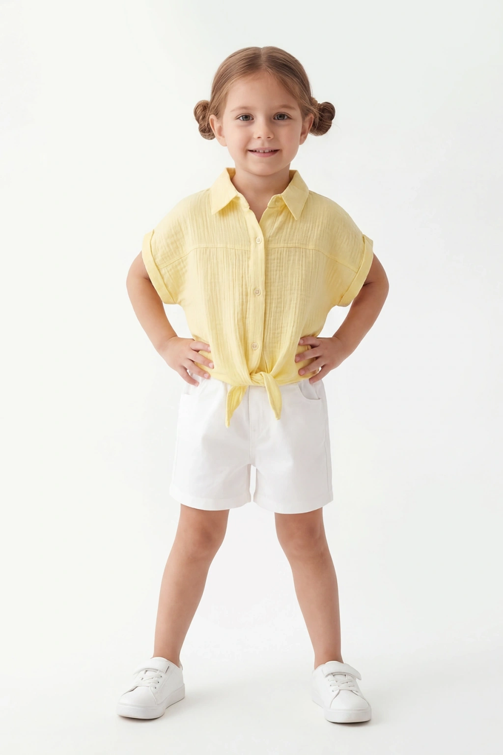 Üst parça düğmeli ve bağlama detaylı tasarımıyla modern bir stil sunarken, alt şort rahat kesimiyle hareket özgürlüğü sağlar. Soft renk geçişleri ve minimal tasarım anlayışıyla Avrupai bir stil yakalanmıştır.
