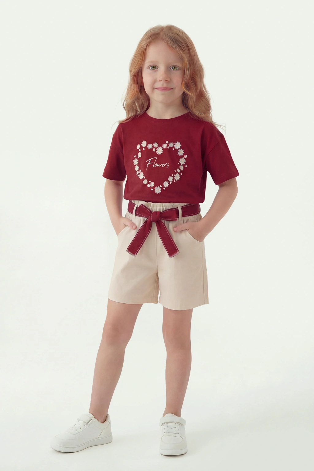 Kırmızı tonlarda çiçek baskılı tişört, enerjik ve sevimli bir görünüm sunarken; bej renkli şort ise modern ve sade bir kombin oluşturur. Bel kısmındaki bağlama detayı ürüne ekstra stil kazandırır.
