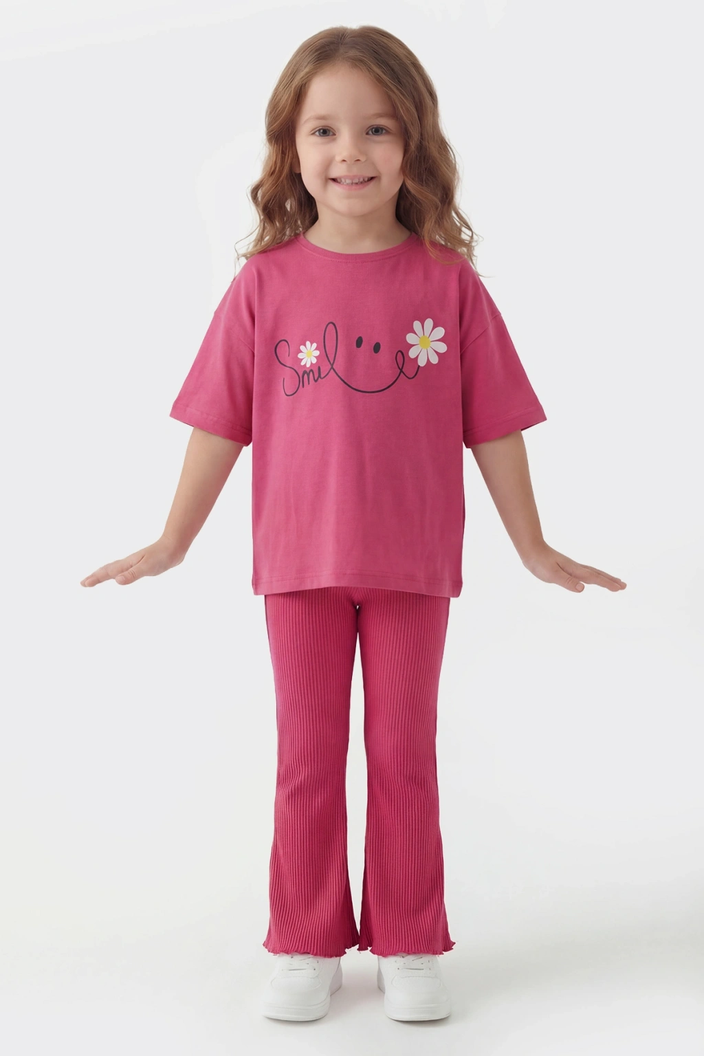 Bu yaz sezonunda kız çocuklar için ideal bir kombin! %100 pamuklu tişört ve tayt takımı, hem şıklığı hem de rahatlığı bir arada sunuyor.