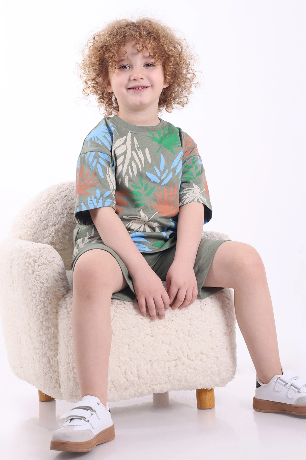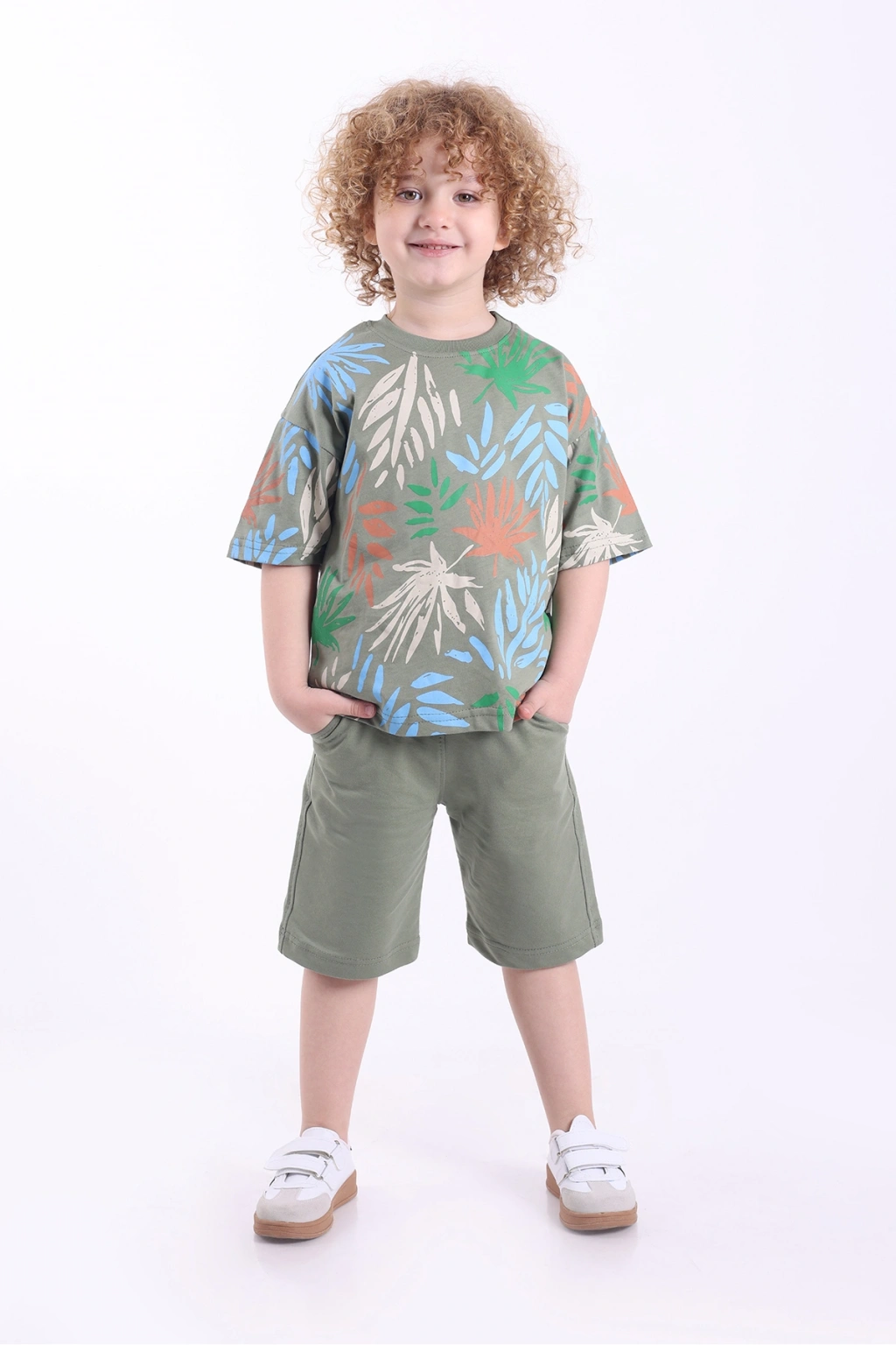 - Palmiye deseniyle çocukların enerjisini yansıtan, göz alıcı bir görünüm sunar.; - Rahat kesimi sayesinde hareket özgürlüğü sağlar; çocuklar gün boyu rahat ederler.; - Günlük kullanım için ideal olan bu takım, casual tarzıyla her ortama uyum sağlar.; - %100 pamuk materyali ile cildi tahriş etmeden yumuşak bir dokunuş sunar.; - Kısa kollu t-shirt tasarımı yaz ayları için serinlik ve konfor sağlar.; - Alt-üst kombinasyonu ile pratik giyim imkanı tanır; kolayca eşleştirilebilir.; - Düşük kol tipi modern bir stil oluştururken aynı zamanda rahatlık sunar.; - Cepli şort detayı hem fonksiyonel hem de şık bir dokunuş ekler.;