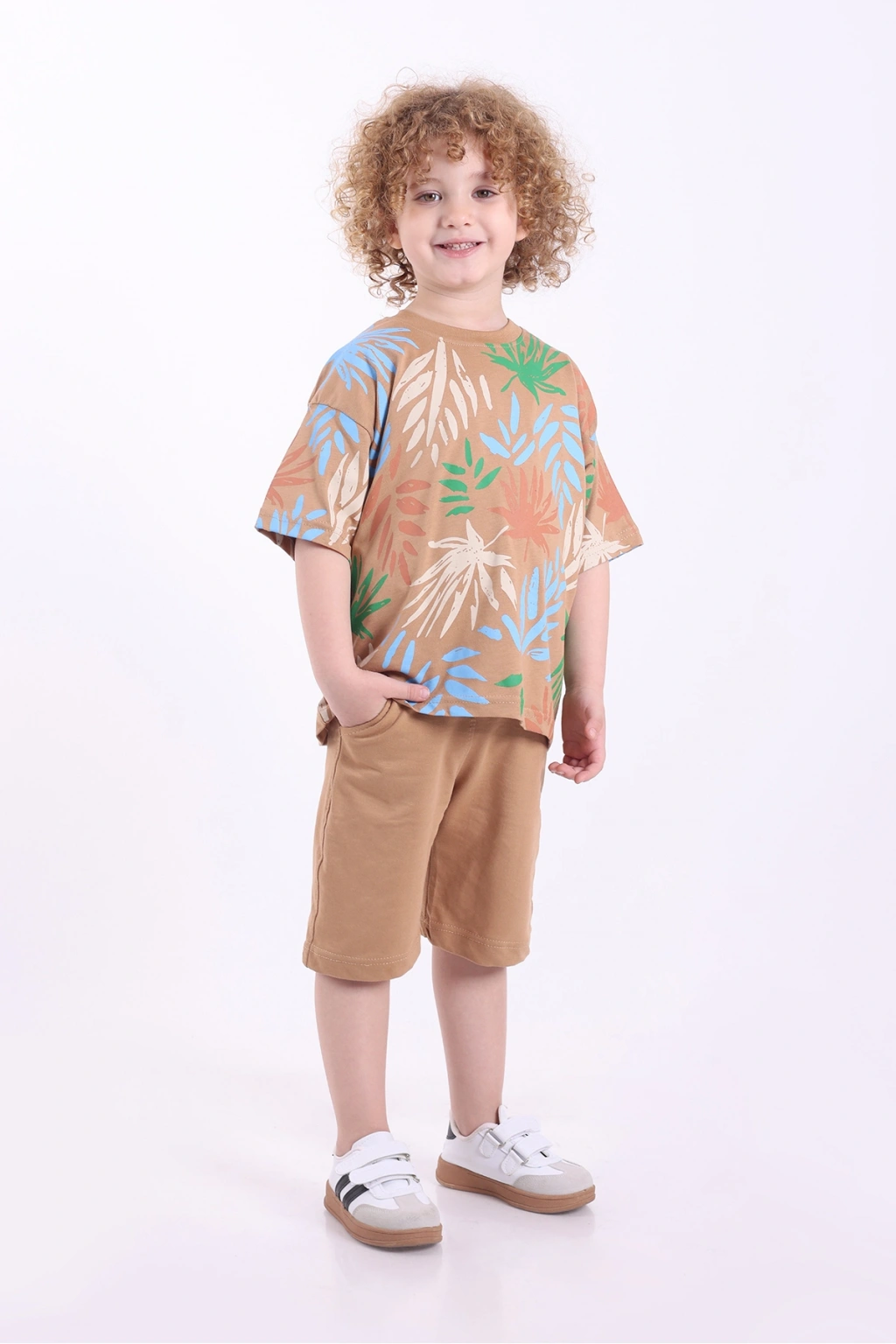 - Palmiye deseniyle çocukların enerjisini yansıtan, göz alıcı bir görünüm sunar.; - Rahat kesimi sayesinde hareket özgürlüğü sağlar; çocuklar gün boyu rahat ederler.; - Günlük kullanım için ideal olan bu takım, casual tarzıyla her ortama uyum sağlar.; - %100 pamuk materyali ile cildi tahriş etmeden yumuşak bir dokunuş sunar.; - Kısa kollu t-shirt tasarımı yaz ayları için serinlik ve konfor sağlar.; - Alt-üst kombinasyonu ile pratik giyim imkanı tanır; kolayca eşleştirilebilir.; - Düşük kol tipi modern bir stil oluştururken aynı zamanda rahatlık sunar.; - Cepli şort detayı hem fonksiyonel hem de şık bir dokunuş ekler.;